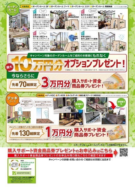 ガーデンルームコースとしては、10万円分のオプションプレゼント(機種によります)と、今なら先着70組限定で3万円分購入資金を商品券にてプレゼント!