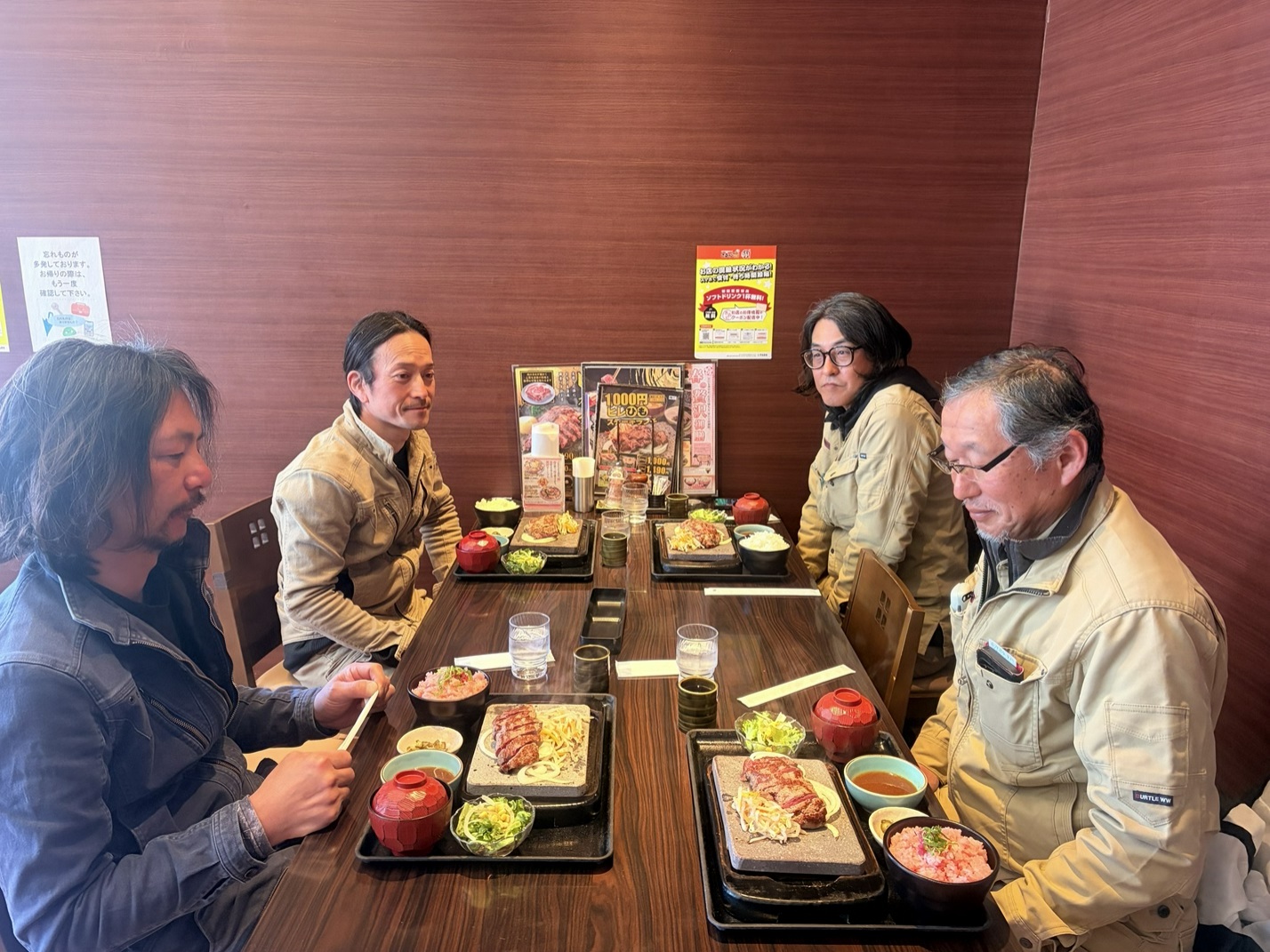 ランチミーティング(工事班) 2026年03月04日(水) / EXTERIOR事業部 庭匠館では、社員間でランチ会を開催することで、交流を深めていただくことを推奨しています。 今回は施工班メンバーにてランチ会を開催しました。 ちょっと贅沢、ステーキのお店のようですね。 すでに名前が「贅(ぜい)」ですから! エクステリア事業部では工事品質を確保するため冬季間の工事は原則中止となります。 3月に入り春を迎えましたので、いよいよ今年も工事開始です。 「庭匠館品質」の現場をご提供できるようによろしくお願いします!