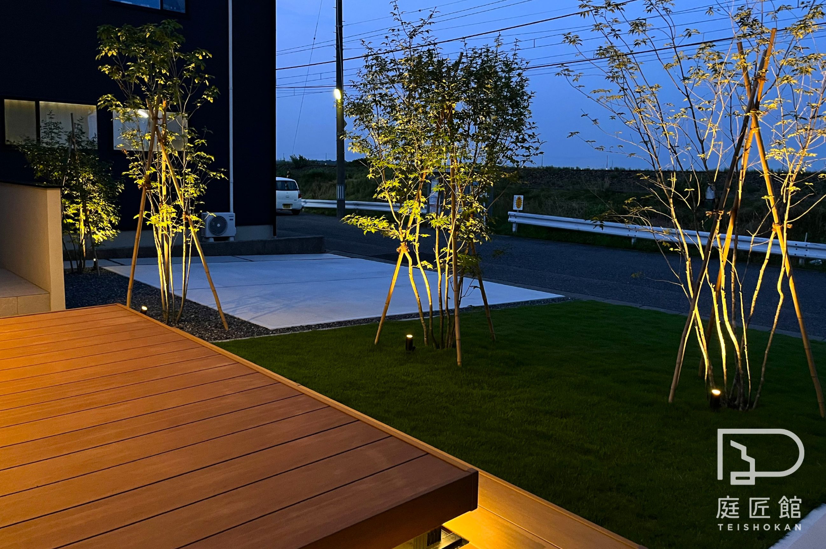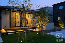 自宅でありながら別荘のような庭があり、アオダモ林のむこうに電車が走ります。夜間のカフェのようなライティングも魅力的なエクステリアです。