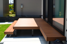 デッキは三協アルミ「ヴィラウッド」を変形させ、BBQの際に活躍するベンチも設けました。水栓パンの横に散水ホースがぴったり納まるよう計算し、設計しています。